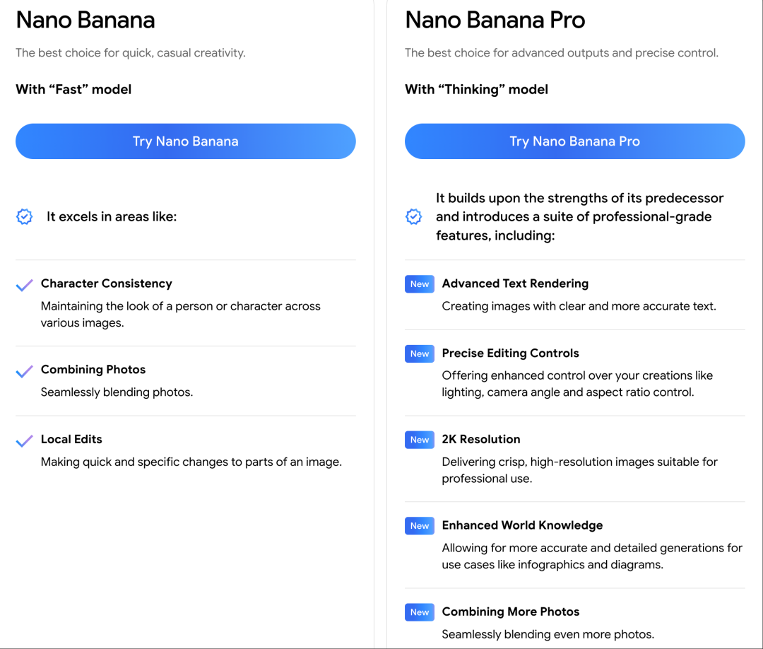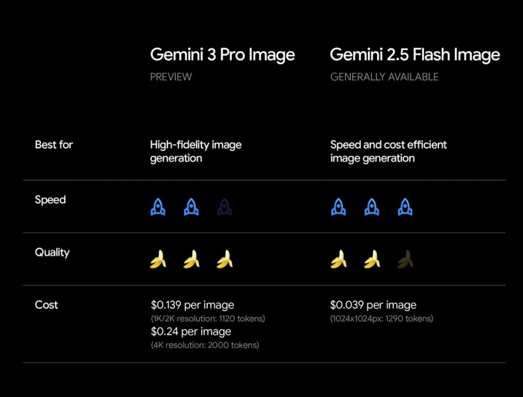 使用 Nano banana (Gemini 2.5 Flash Image)获取更快、更低成本的图像生成/编辑;使用 Nano banana Pro(Gemini 3 Pro Image)处理更加复杂、要求更高的任务,但成本与延迟也更高。